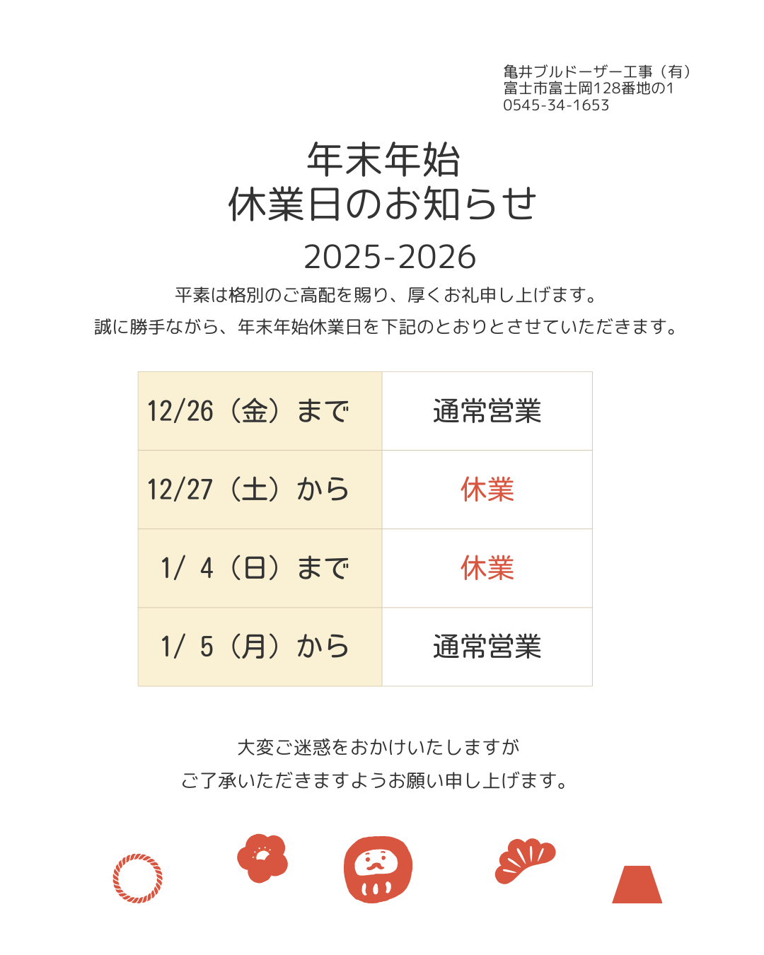 2025-2026年 年末年始 休業のお知らせ ホーム » お知らせ » 2025-2026年 年末年始 休業のお知らせ 平素より格別のご高配を賜り、厚く御礼申し上げます。 誠に勝手ながら、弊社では下記の期間を年末年始休業とさせていただきます。 ■休業期間 2025年12月27日(土)~ 2026年1月4日(日) 休業期間中にいただきましたお問い合わせにつきましては 2025年1月5日(月)より順次対応いたします。 期間中は何かとご不便をおかけすることと存じますが 何卒ご理解賜りますようお願い申し上げます。